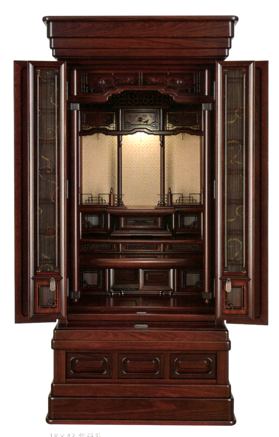 50年以上お仏壇制作に携わり、培った感性と技術力で造り上げた伝統唐木仏壇の枠を集めた傑作です。独創的な存在感は「仏王」の名にふさわしい壮厳さを醸し出しています。