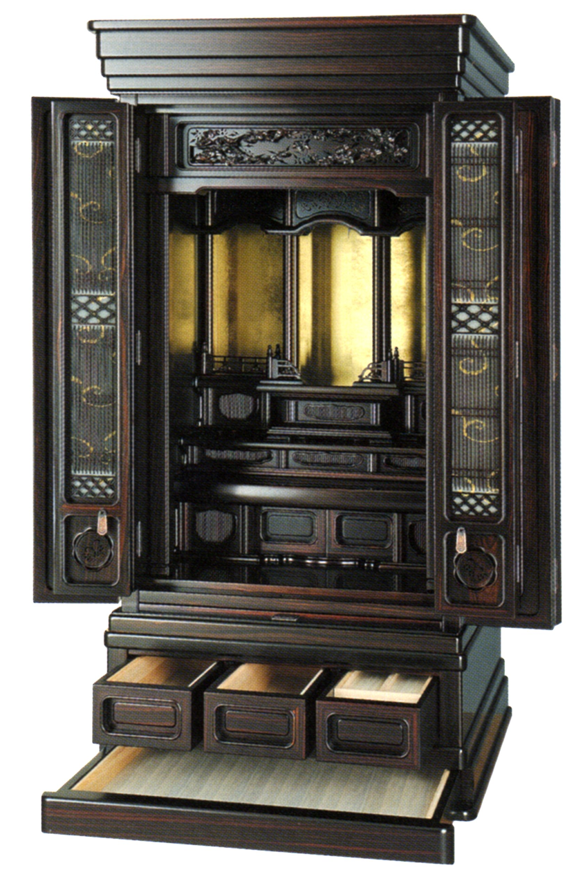 LEDライトを搭載した唐木モデルで、台輪大引出など使い勝手にも優れたお仏壇です。職人の繊細な技が光る彫刻を随所に施しています。